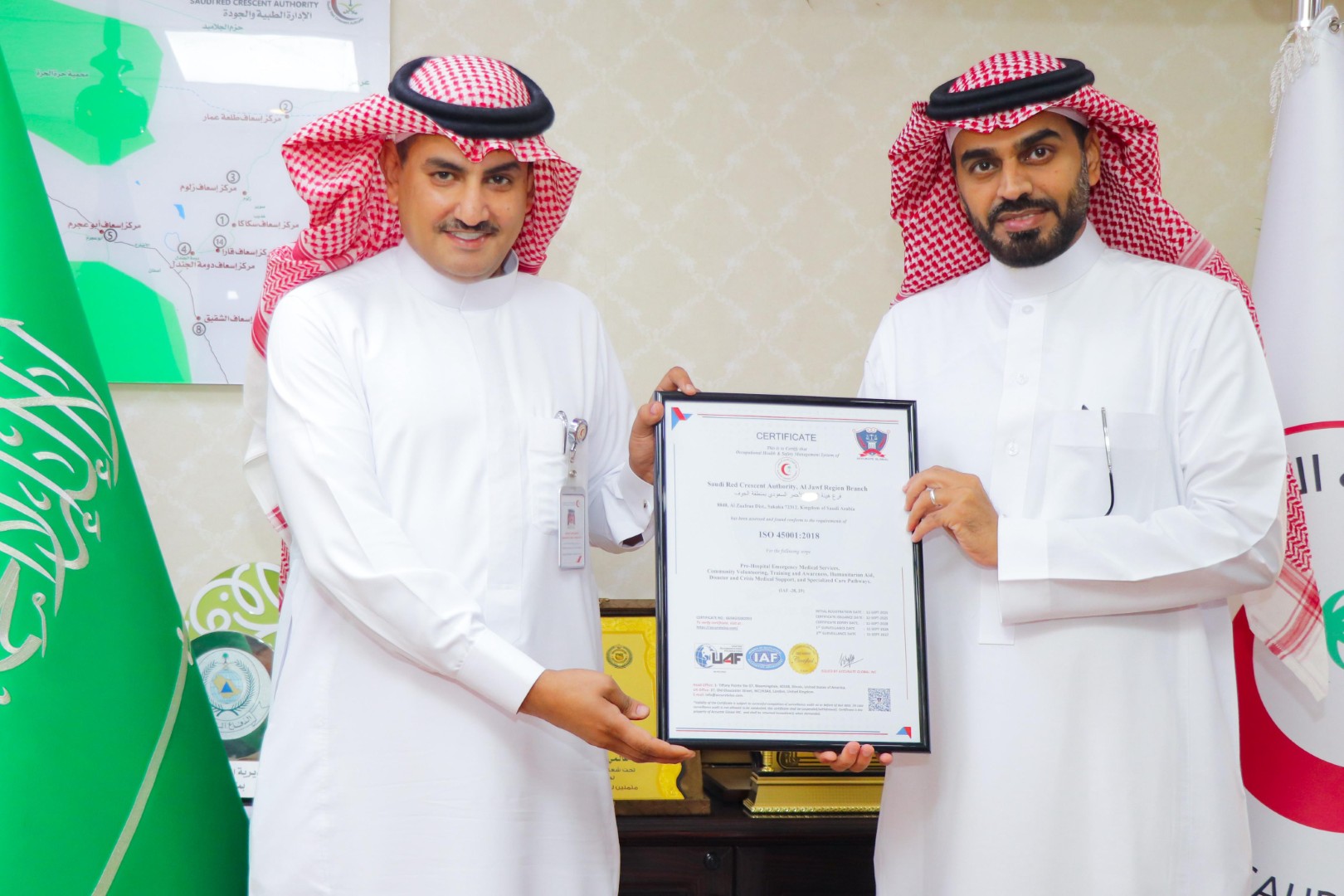 The Saudi Red Crescent Authority’s Al Jouf branch has achieved a significant milestone by obtaining the ISO 45001 certification in Occupational Health and Safety Management Systems, becoming the first branch across the Authority to receive this prestigious international accreditation. In addition, the branch was also awarded ISO 9001 certification for Quality Management Systems, following its successful compliance with global quality standards and implementation of best administrative and organizational practices.