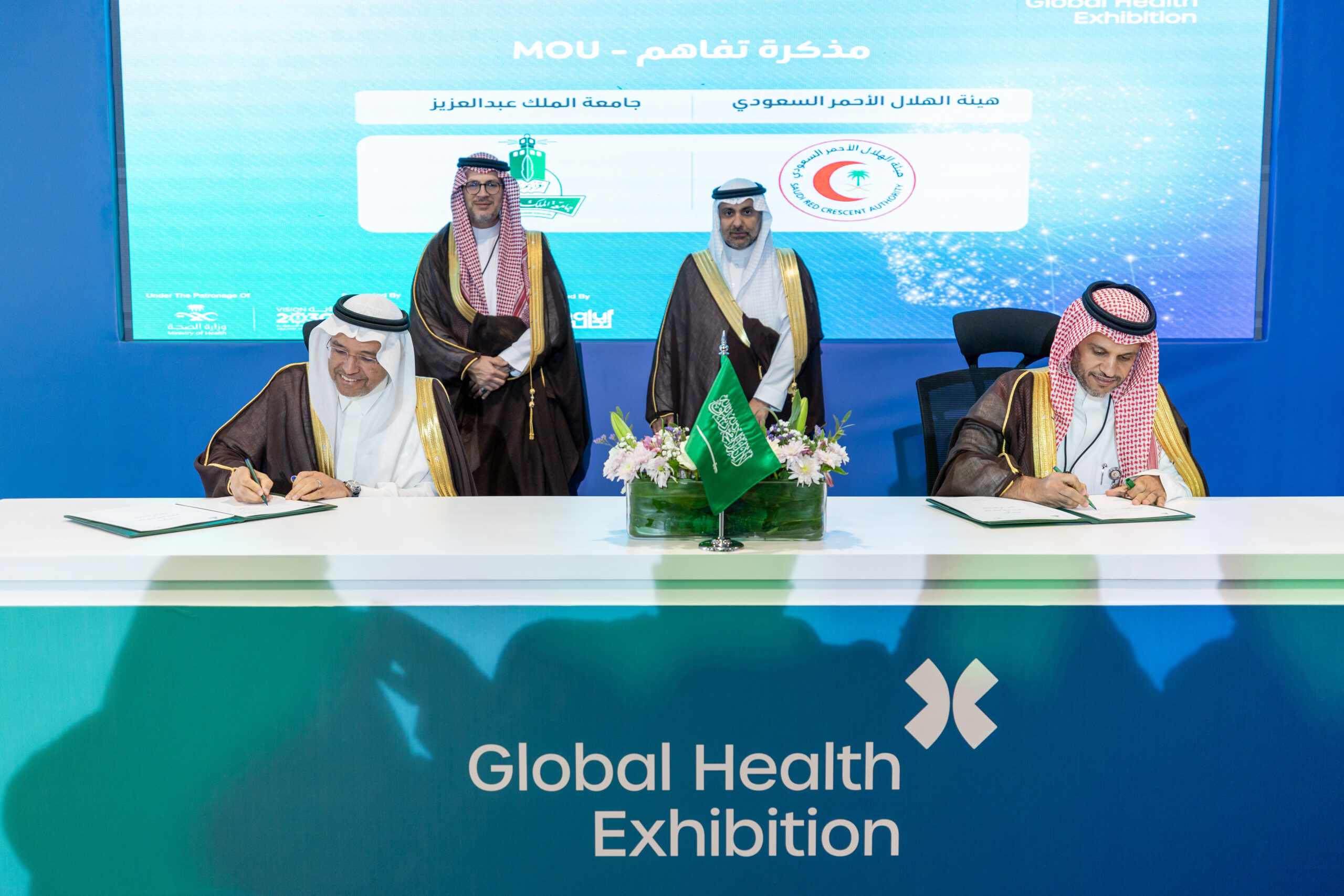 The Saudi Red Crescent Authority signed a Memorandum of Understanding (MoU) with King Abdulaziz University, under the patronage of H.E the Minister of Health and Chairman of the Board of Directors of the Saudi Red Crescent Authority, Fahd bin Abdulrahman Al-Jalajel, on the sidelines of the Authoritys participation in the Global Health Exhibition 2024 at the Riyadh International Convention and Exhibition Center – Malham, held from October 21 to 23, 2024.